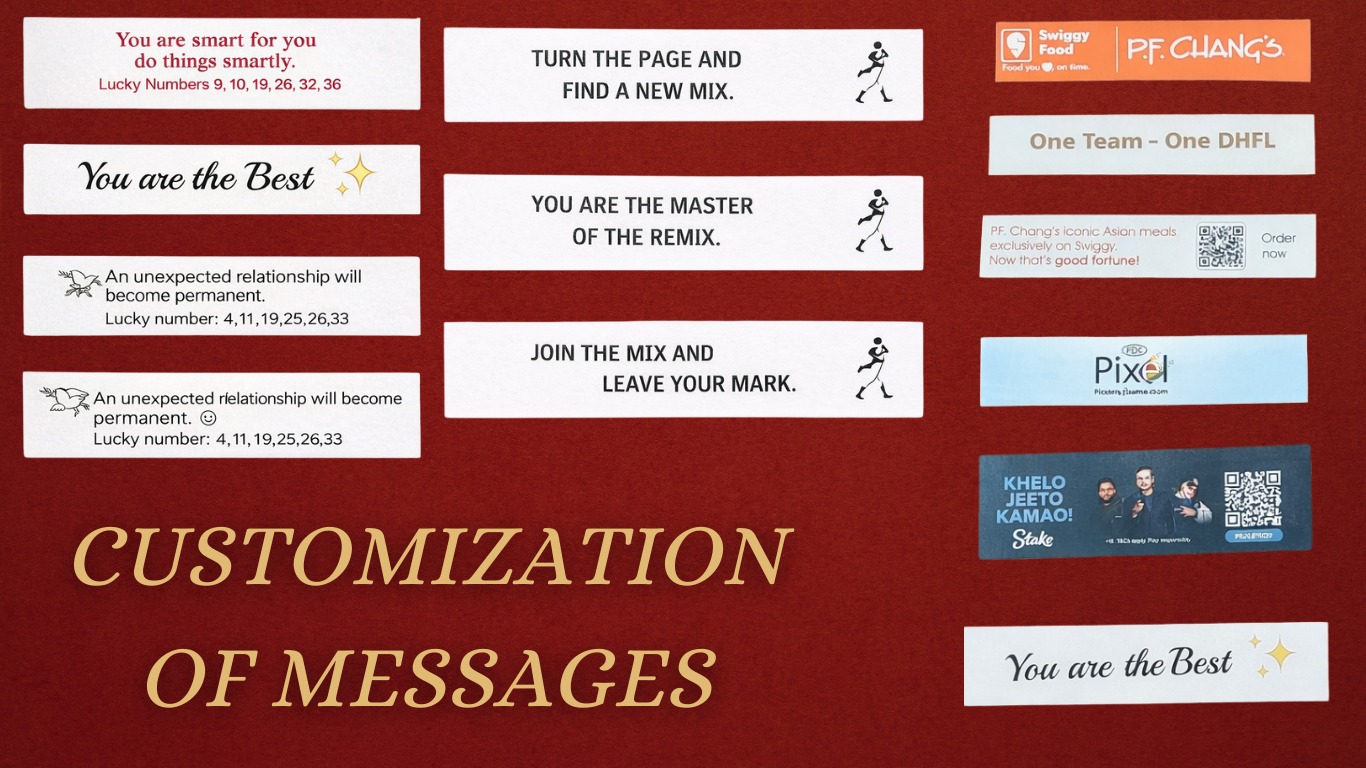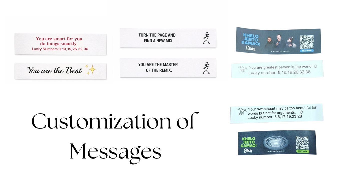 Customization of messages – We customize personalized fortune cookie Messages for weddings, baby showers, festive gifting, corporate launches, restaurants, and other special occasions. Messages can be romantic, fun, inspirational, or brand-specific, making each cookie meaningful and memorable.