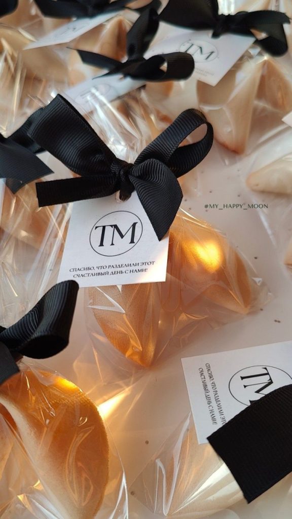 Elegant gold fortune cookies packed in clear pouches with a black ribbon and personalised tags. Perfect for wedding favours, corporate gifting, hotels, birthdays, and luxury events.